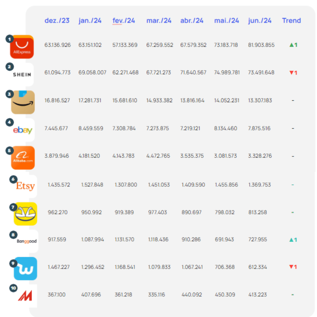 數(shù)據(jù)顯示,速賣通在巴西6月的訪問量增長達11.9%,主要來源于網(wǎng)站訪問量。報告指出,亞洲三大電商巨頭AliExpress、Shein 和Shopee正在巴西迅速崛起,合計已占據(jù)巴西電子商務(wù)市場 15.4% 的份額,并持續(xù)打破紀(jì)錄。
